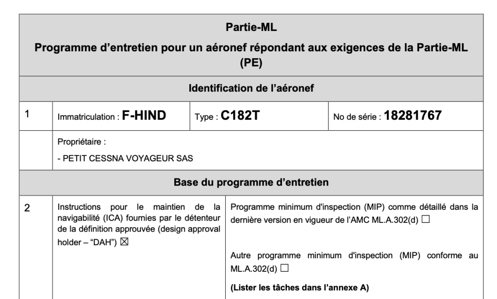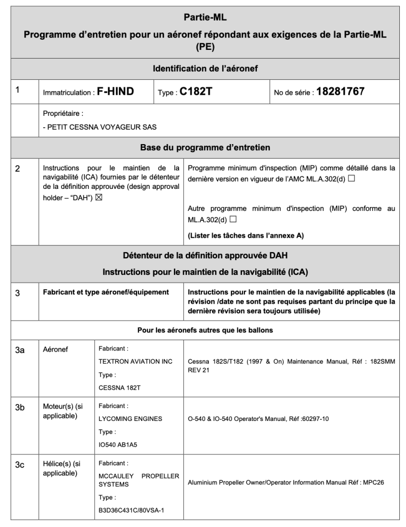 Sur la première page, vous indiquerez l’immatriculation, le type, le numéro de série et le propriétaire de l’aéronef (tels qu’ils figurent sur le certificat d’immatriculation). Prenez ensuite une option pour la base du programme : soit l’AMM, soit le MIP (options 1 ou 2 ci-dessus). Ensuite, vous inscrirez les manuels d’entretien, avec les révisions, pour l’aéronef, le moteur et l’hélice.